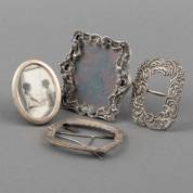 Drie diverse zilveren fotolijstjes en zilveren gesp, veelal 2e en 3e gehalte, brutogewicht 194 gram -defecten-