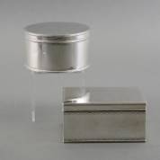 Rechthoekige en ronde 1e gehalte zilveren koektrommels met gegraveerde en geprofileerde randen, meester: Hendrik Kamerlingh II, Amsterdam, 1763, gewicht 820 gram, 7 × 14 × 10 en Ø 12,3 cm -rechthoekige trommel heeft behoorlijke deuk in de bodem-
