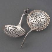 Twee zilveren strooilepels, meester: Bartholomeus Smits, Schoonhoven, jaarletters C (1776 of 1796) en S (1768 of 1790), gewicht 53 gram