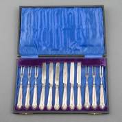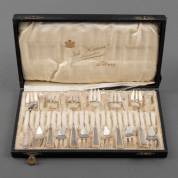 Set van zes fruitcouverts met 1e gehalte zilveren grepen met bladdecor, in cassette, meester: Levi & Salaman, Sheffield, 1917, brutogewicht 220 gram