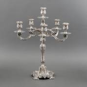2e gehalte zilveren (916/1000) zeslichts kandelaber, gedecoreerd met bloemen, voluten, kwabben en bladerdecor, Porto, Portugal, 20e eeuw, (bruto)gewicht 2088 gram, 50 × 38 × 38 cm