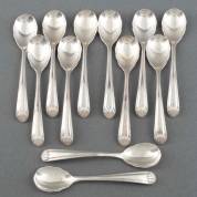 Twaalf 2e gehalte zilveren theelepels met geschulpte bak, de steel met schelpvormig ornament, in cassette, meester: Gerritsen & van Kempen, Zeist, 1926-1961, gewicht 168 gram