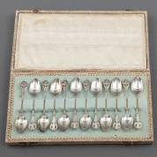 Twaalf 2e gehalte zilveren koffielepeltjes met getorste steel en opengewerkt bladvormige ornament, meester: J.M. van Kempen & Zonen, Voorschoten, circa 1900, gewicht 146 gram, circa 11 cm, in cassette W. Voet & Zonen