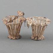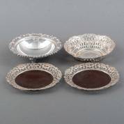 Paar 2e gehalte zilveren flessenbakken met losse bakelieten bodem, en twee schaaltjes, 1e en 3e gehalte zilver, gewicht zilver 288 gram, mandje Ø 13,5 cm