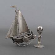 Zilveren signet met familiewapen, het greepje gevormd als Atlas met wereldbol, meester: A. Schoorl, Kunsthandel Luctor, Amsterdam, 1946-1981 -greepje vermoedelijk later aangezet-, daarbij: 2e gehalte zilveren miniatuur schommelschuit, meester: J. Niekerk, Schoonhoven, 1979, gewicht 57 gram, signet 5 × 2,5 cm