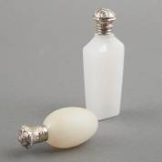 Eivormige wit opaline parfumflacon en wit opaline parfumflacon met 2e gehalte zilveren montuur en dop, grootste met glazen binnenstopje, grootste 10 cm -dop eivormige fles defect-