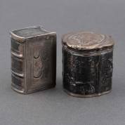 Gecontourneerd zilveren lodereindoosje met gedreven jachtdecor, meester: Pieter Gijskes, Schoonhoven, 1807, 3 × 3 × 2,5 cm, en lodereindoosje in de vorm van een boekje, onduidelijk meesterteken, Schoonhoven, 1798, 3,5 × 2,5 × 1,5 cm, gezamenlijk gewicht 36 gram