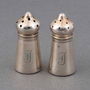 Klein 1e gehalte zilveren peper- en zoutstelletje, beide met gegraveerde letter J, 20e eeuw, gewicht 12 gram, 4,0 × 1,8 cm -enkele minieme deukjes-