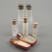 Zes kristallen parfumflacons met veelal 2e gehalte zilveren montuur en dop, vier binnenstopjes aanwezig, één flacon in foedraal