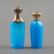 Twee blauw glazen parfumflacons, beide met verguld 2e gehalte zilveren montuur en dop, één glazen binnenstopje aanwezig, grootste 10 cm