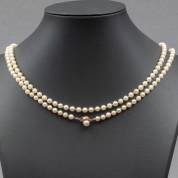 Tweestrengs parelcollier van en-chûte geknoopte gecultiveerde parels aan 14kt witgouden bolslot gezet met parel, brutogewicht 61,4 gram, circa 50 cm