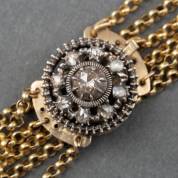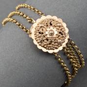 14kt gouden choker van driestrengs jasseronschakels, aan 14kt gouden bakslot met een rozet van in zilver gezette roosdiamanten, brutogewicht 20,8 gram, 36 cm
