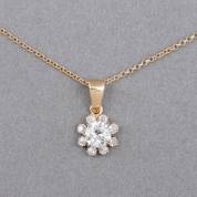 18kt gouden jasseron schakelcollier, waaraan 18kt gouden hanger gezet met diamant in oud mijnslijpsel, omgeven door acht kleinere diamanten in oud mijnslijpsel, totaal circa 1.15ct, brutogewicht 3,0 gram, collier circa 45 cm, hanger Ø 8,5 mm