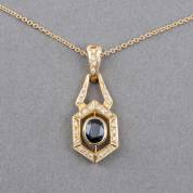 18kt gouden jasseron schakelcollier waaraan een 18kt gouden hanger gezet met ovaal gefacetteerde blauwe saffier, omgeven met achtkantgeslepen diamanten, totaal circa 0.24ct, brutogewicht 8,6 gram, collier 45 cm, hanger 3 cm