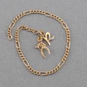 14kt gouden Figaro schakelarmband, waaraan twee 14kt gouden bedels, één hoefijzer en letter R gezet met diamantje, brutogewicht 5,2 gram, 19 cm