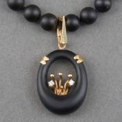 Collier van zwart matglazen bolkralen, vier 14kt gouden tussenkralen, aan 14kt gouden karabijnsluiting, waaraan een afneembare ovale 14kt gouden- en zwart matglazen hanger, gezet met twee briljantgeslepen diamanten, brutogewicht 28,2 gram, 40 cm, hanger 4 cm