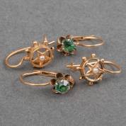 Twee paar 14kt gouden oorhangers, één paar gezet met zaadpareltje, het andere paar gezet met groen kristal, brutogewicht 2,2 gram.1,5 cm
