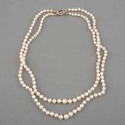 Twee strengs en-chûte geknoopt parelcollier van gecultiveerde parels, aan 14kt gouden en zilveren sluiting, gezet met roosgeslepen diamantje, de achterzijde met bloemgravering, met veiligheidsachtje, 42 cm