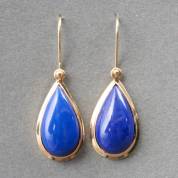 Paar 14kt gouden oorhangers gezet met peervormig cabochongeslepen lapis lazuli, brutogewicht 5,2 gram, 4 cm