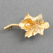 14kt gouden bloemvormige broche, het hart gezet met faux parel, speld 14kt, brutogewicht 4,4 gram, 4 × 2 cm