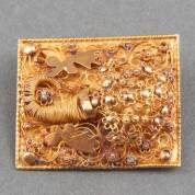 Rechthoekige 18kt gouden streekdrachtbroche gedecoreerd met filigrain en spinnetjes, gewicht 7,2 gram, 3 × 2 cm