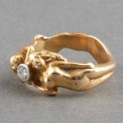 14kt gouden ring gevormd door twee figuren: man en vrouw, gezet met een briljant geslepen diamant in platina zetting, brutogewicht 8,6 gram
