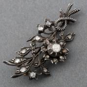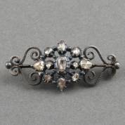 2e gehalte zilveren opengewerkte broche gezet met elf roosgeslepen diamanten in dichte zetting aan14kt gouden pin, brutogewicht 6 gram, circa 4 × 1,5 cm