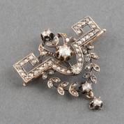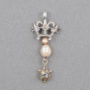 Samengestelde 2e gehalte zilveren en gouden hanger, zilveren kroon met hangoog gezet met drie roosdiamanten, waaronder gouden bol, parel en gouden hanger gezet met getinte roosdiamant, 19e eeuw, brutogewicht 2,6 gram, 4 cm -parel beschadigd-
