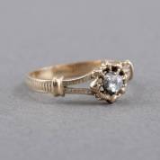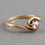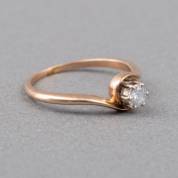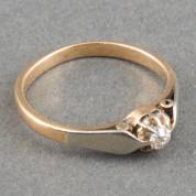 14kt wit- en geelgouden solitairring gezet met diamantje in oud slijpsel gezet in spiegelchatonzetting, mt. 14,5, brutogewicht 1,6 gram
