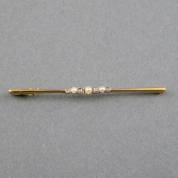 14kt gouden speld gezet met drie zaadpareltjes en vier aangeslepen diamantjes, brutogewicht 2,2 gram, circa 6 cm