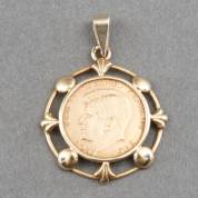 Gouden herinneringsmunt J.F. Kennedy, 1961-1963, gevat in 14kt gouden montuur en BWGG hangoog, gewicht 2,2 gram, Ø 2 cm