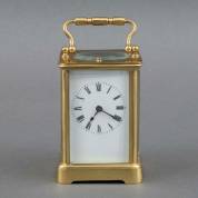 Messing reiswekkertje met facetgeslepen ruitje en witgeëmailleerde wijzerplaat met Romeinse cijfers -inclusief sleutel-, 11,5 × 8 × 6 cm