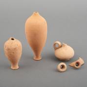 Divers archeologisch aardewerk: twee unguentaria, één kannetje, en twee fragmenten van hals, mogelijk Klein-Azië, hellenistische periode, grootste 15 × Ø 7 cm, herkomst: oud-directeur Museum Kam, Nijmegen
