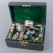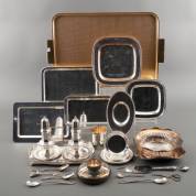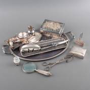 Divers verzilverd en onedel, waaronder: ovaal dienblad met twee grepen, sigarendoos met repoussé decor, wildschaar en vergrootglas, blad 64 × 41 cm
