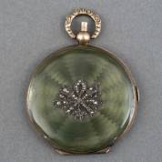 BWZG email poederdoos met strikdecor op de voorzijde -chip uit email-, Ø 4,8 cm