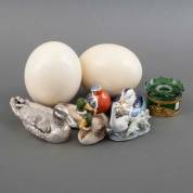 Vier diverse vogelbeeldjes, peper-en-zoutstel in de vorm van eenden, glazen inktstel met zwanendecor en een paar struisvogeleieren