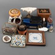 Divers kleingoed, waaronder: auto, schelp op voet, aardewerk konijn, en twee tegels