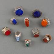 Tien BWZG etnische ringen gezet met natuursteen, Noord-Afrika en Midden-Oosten, brutogewicht 292 gram, grootste ring 4 cm
