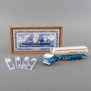 Nedlloyd memorabilia: ingelijst tegeltableau, miniatuur DAF 95 vrachtwagen met kantelkabine en bulktrailer -met kleine defecten-, en vier verzilverde herdenkingslepeltjes
