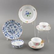 Divers Meissen porselein: twee verschillende kop-en-schotels, een bordje met polychroom bloemdecor, en een bordje en een mandje met Zwiebelmuster -één schotel gelijmd, vergulde randen licht sleets-, grootste bordje Ø 19,5 cm