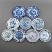 Negen diverse borden met blauw-witte decors, 18e-20e eeuw -defecten-