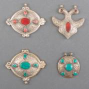 Vier BWZG etnische hangers, twee gezet met carneool en twee met turkoois, Kulchi stam, Afghanistan, brutogewicht 243 gram, circa 7 cm