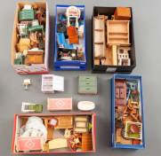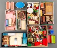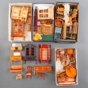 Verzameling houten en kunststof poppenhuismeubels, 20e eeuw -gebruikssporen-, circa 10 cm