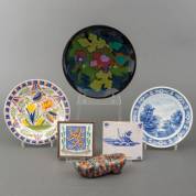 Divers Nederlands aardewerk: drie borden, twee tegels, en één klompje, grootste bord Ø 25 cm