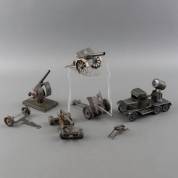 Zeven stuks blikken militair speelgoed: vier kanonnen, vrachtwagen met schijnwerper, machinegeweer, en los affuit, jaren '30/'40, diverse fabrikanten -enkele defecten en missende delen-, vrachtwagen 12 × 18,5 × 9,5 cm