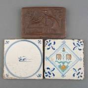 Kwadraattegel met kievitsbloem, cirkeltegel met muis, en haardsteen met Bijbelse voorstelling: Samson, 17e/18e eeuw -enkele defecten-, 13 × 13 cm
