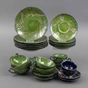 Porseleinen theeserviesgedeelte met zilveren inlegwerk, uitvoering Richard Ginori, midden 20e eeuw, bestaande uit: drie groene en twee blauwe koffiekop-en-schotels, vijf theekop-en-schotels, en zes petit-fourbordjes