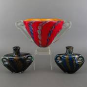 Grote rode glazen oorvaas met geel interieur, uitvoering onbekend, 30 × 52 × 29 cm, en paar blauw-geel gestreepte glazen oorvazen, uitvoering onbekend -één met chip van voet-, 23 × 26 × 11 cm