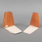 Zeven teakhouten en metalen boekensteunen, vermoedelijk ontwerp Kai Kristiansen, jaren '60 -meerdere met los basement-, 13,5 × 14,5 × 9 cm