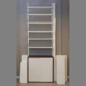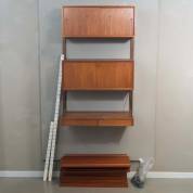 Teakhouten wandmeubel met houten muurbeugels, model Royal System, ontwerp Poul Cadovius, Denemarken, bestaande uit: twee kastjes, één ladeblok, veertien plankjes, één presentatieplankje, en twee muurbeugels, daarbij: twee witgelakte stalen muurbeugels, vermoedelijk later bijgemaakt door eigenaar